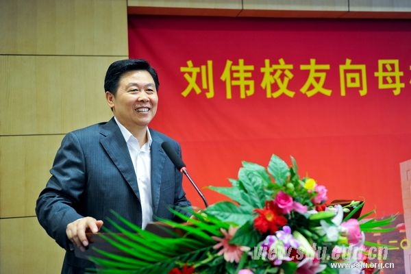 徐显明在致辞中说,刘伟校友是新山东大学成立以来历届毕业生中对母校贡献最大的一位,是毕业生成长为社会领袖的又一个典范,他所创办的鑫福泰公司是校友民企发展中的典型,他本人也在毕业十年后向母校交了一份优秀的答卷。徐显明谈到了杰出校友的两个特征,一是事业成功,在某一领域为民族、国家做出最卓越的贡献,二是始终在关爱着母校,支持母校发展。刘伟校友是将人一生的三种人格——民族人格、自然人格以及学校所给予的人文科学人格完美结合在一起的人,是学校年轻杰出校友的代表。徐显明表示,今天的仪式上山东大学得到的不仅仅是捐赠,更是校友对母校的一片真诚,同时双方拓展了校企合作的新领域,体现了共同为民族国家做贡献的事业心。这是刘伟校友对母校最大的贡献,他为广大校友树立了榜样,相信这次合作定会结出丰硕的成果。